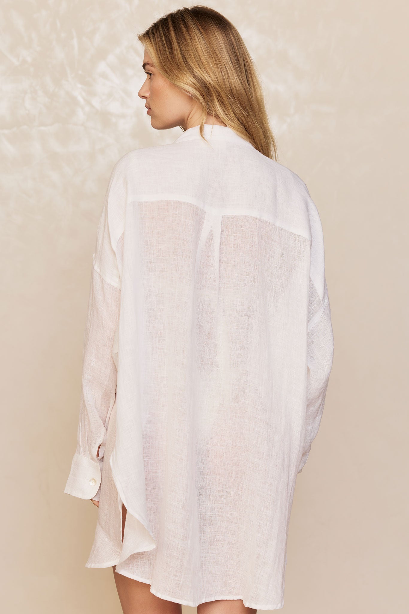 The ultimate beach to bar look can be achieved in the Barcelona Tunic. With an airy oversized fit, this transitional piece can be worn open, over your favorite swimwear or tied at the front with cute pants. Complete with side slits, flowy sleeves and center front seashell buttons.