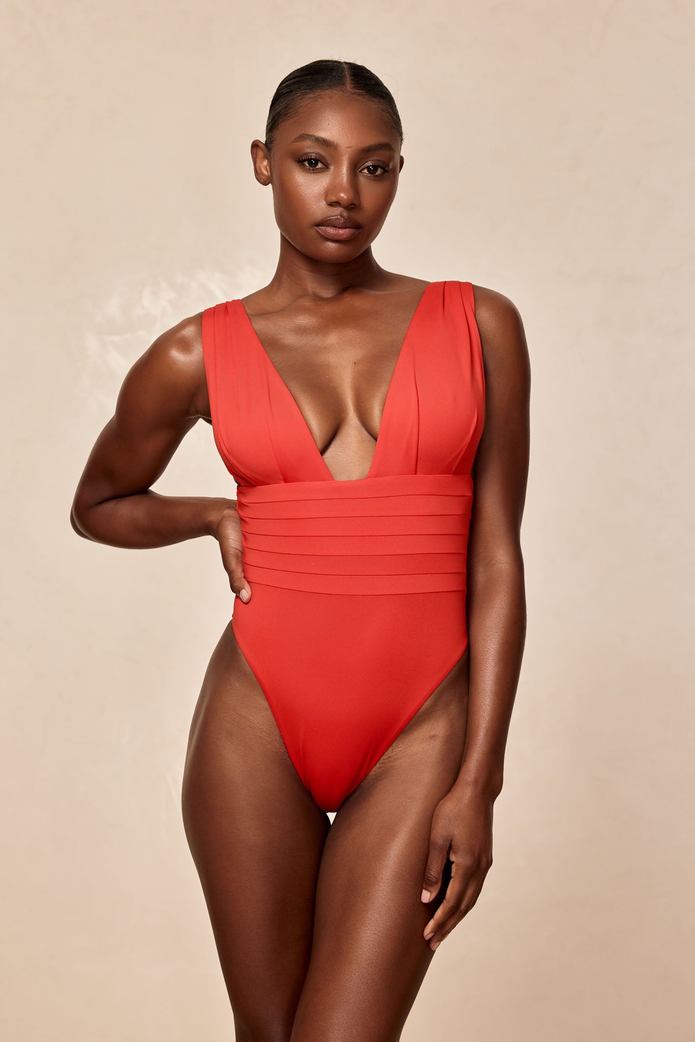 Equal parts sexy & supportive. Our Florence One Piece is the perfect combination of our best selling Aruba & Corsica One Piece. Designed for support and comfort this one piece features a supportive waist with the pleated detailing and wide shoulder straps. Finished with a flattering deep v-neckline and cheeky bottom coverage.?
