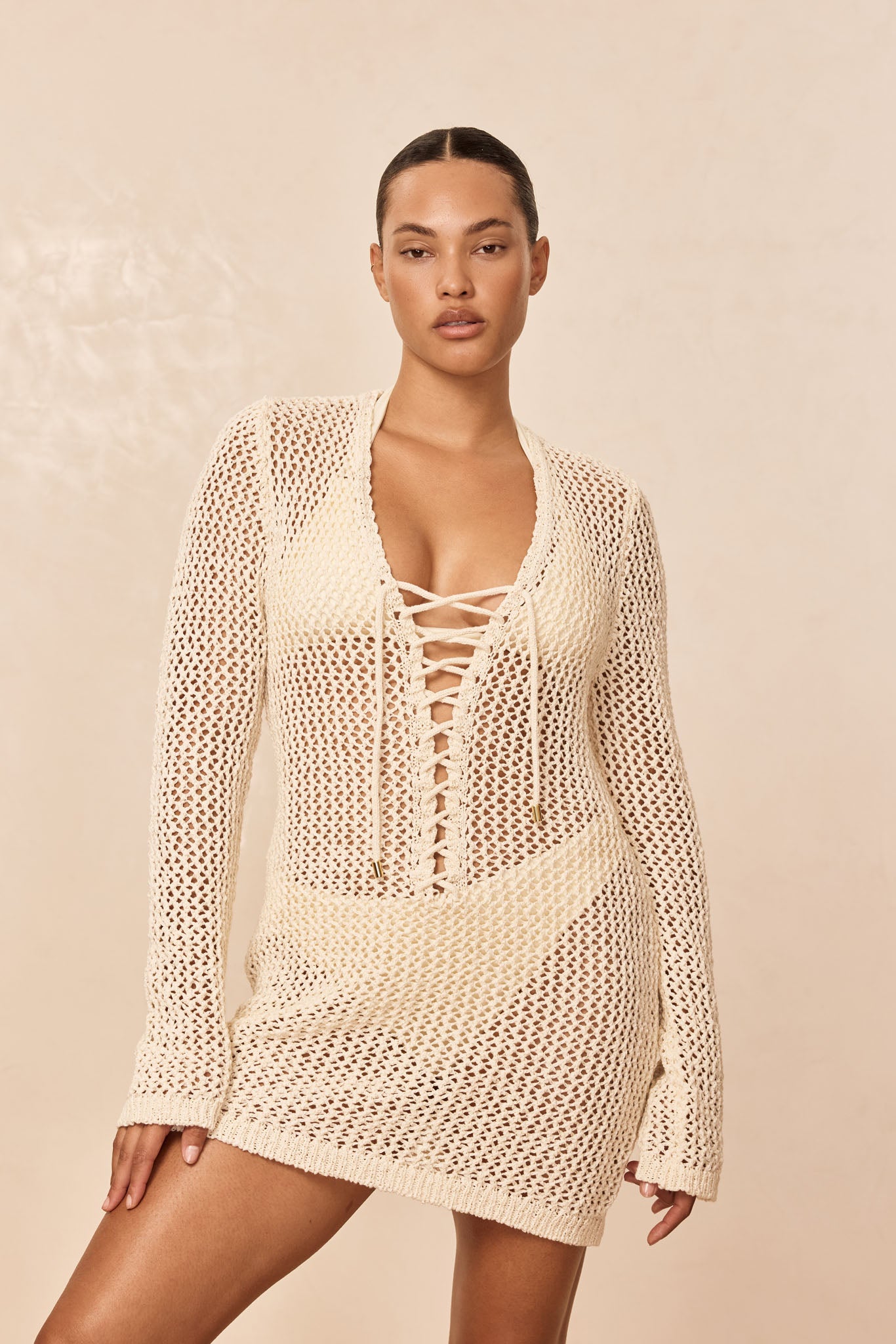 The Corossol Mini Dress features a lace-up plunging neckline with gold accents. Sheer and unlined, its long flared sleeves and flowing silhouette move effortlessly from beach to poolside.