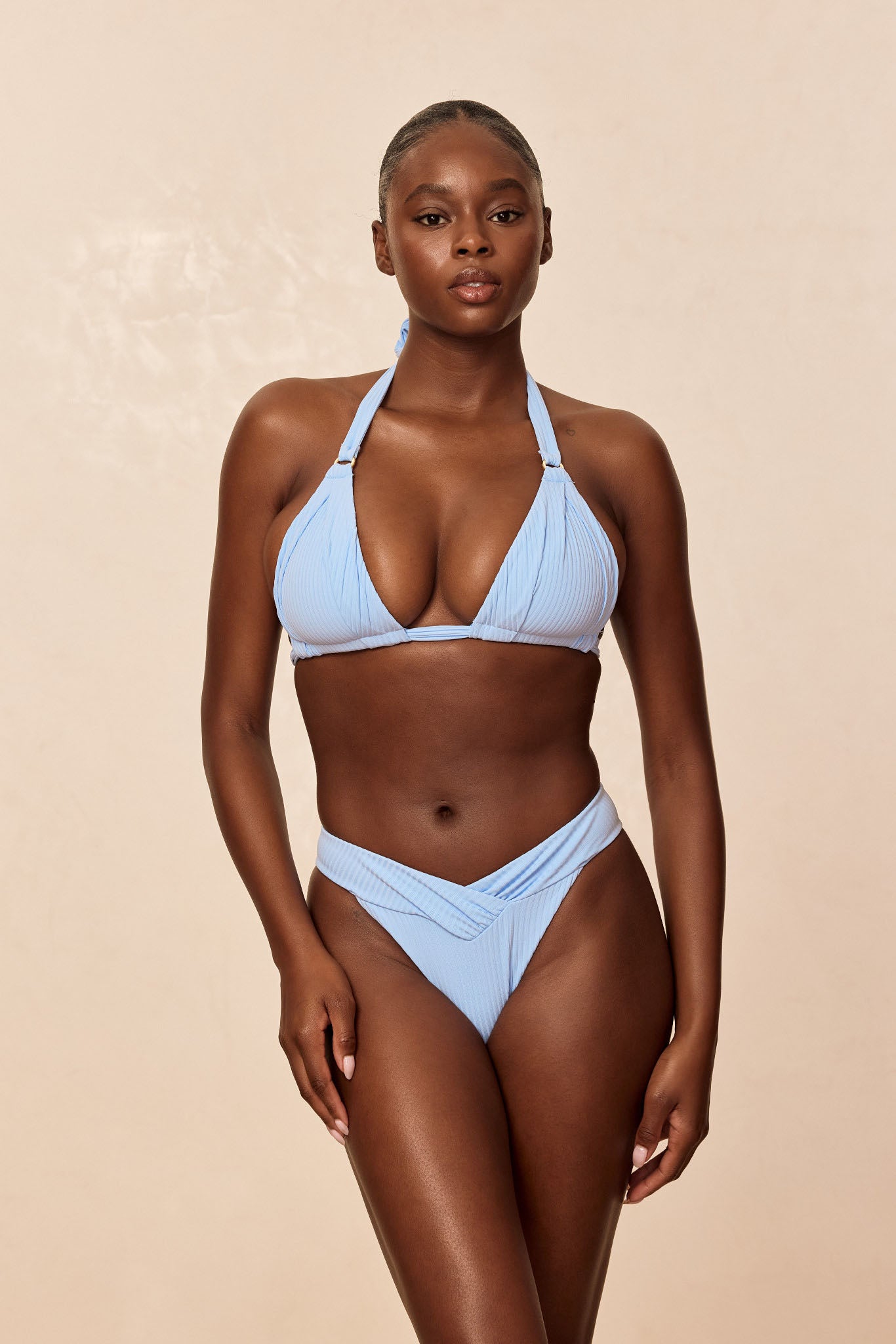 Designed with a chic color block detail and a flattering shirred V-front waist, this swim bottom enhances your curves in all the right places. The high-leg cut and mid-rise fit offer a modern silhouette that’s both sleek and comfortable. Finished with cheeky coverage for a confident, sun-kissed look.