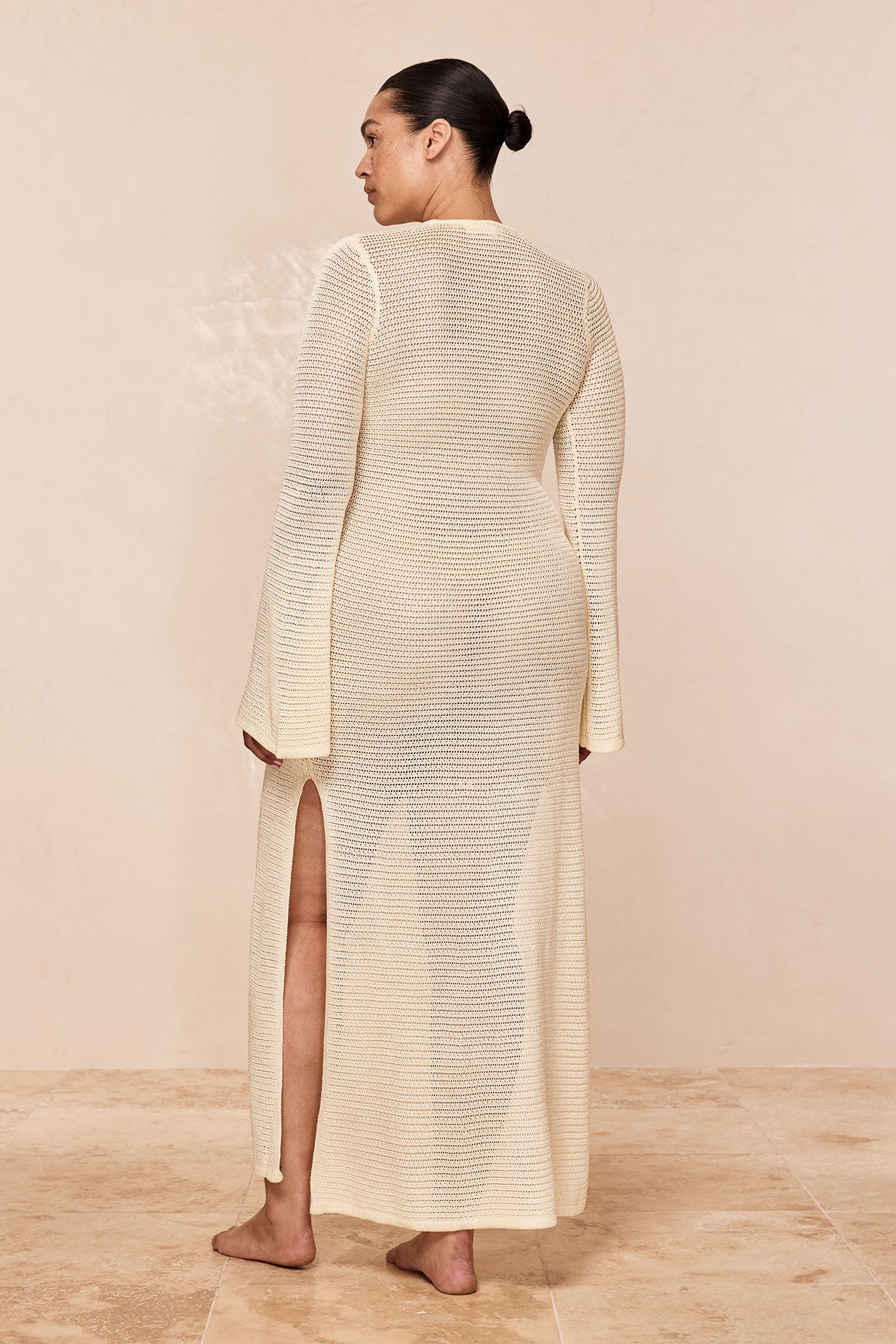 Glamorous and chic! This Montego Dress will make you feel like a star. Made in a lurex crochet knit, this elegant dress with a plunging neckline, gold ring detailing and high side seam slits will make you brighten up any room you walk in. Paired with any of our swim, this dress will elevate any beach look!