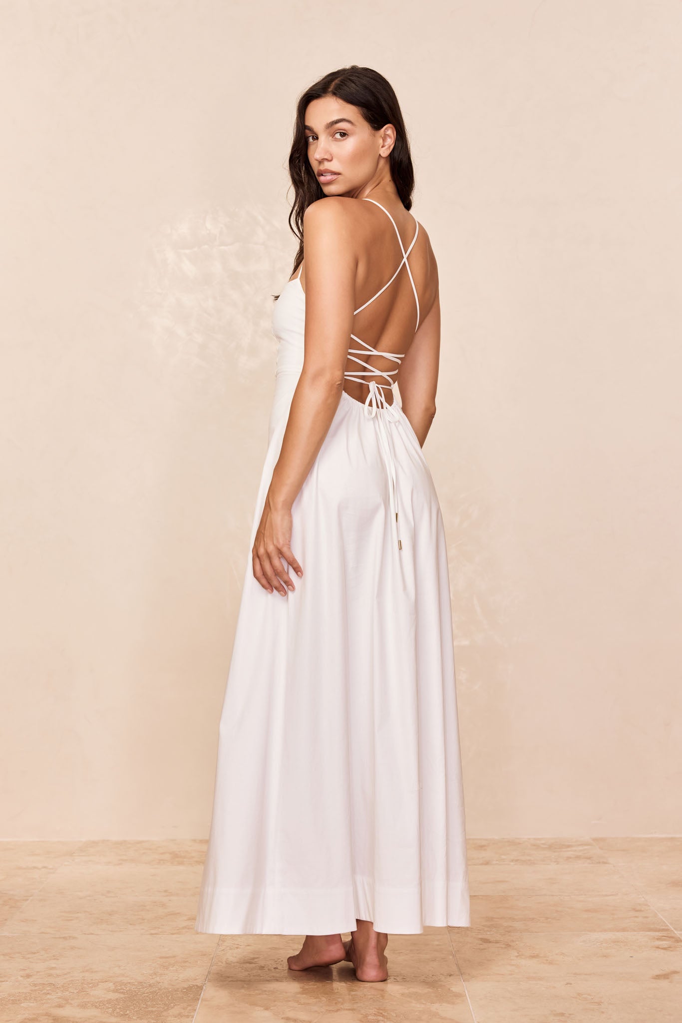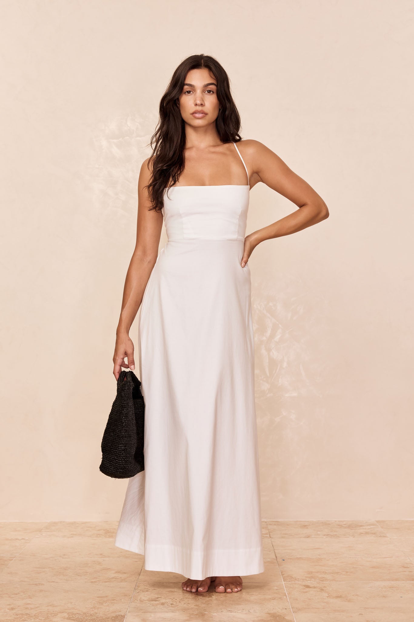 The Montpellier Dress features over-the-shoulder straps, a lace-up back for an adjustable fit, and a fitted waist that flatters every curve. With its ankle-length hem and effortless feel, it’s made for golden hours, date nights, and everything in between.