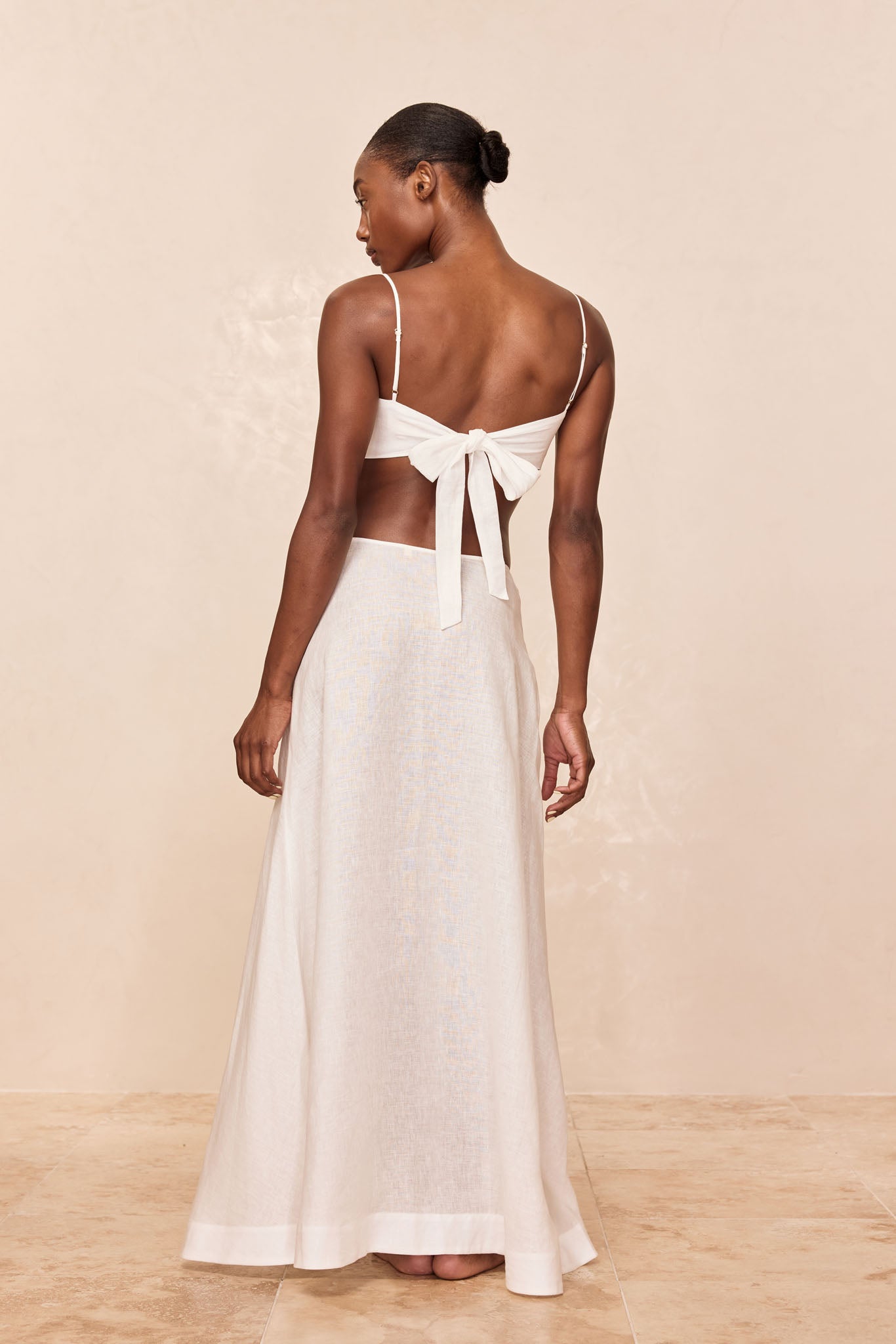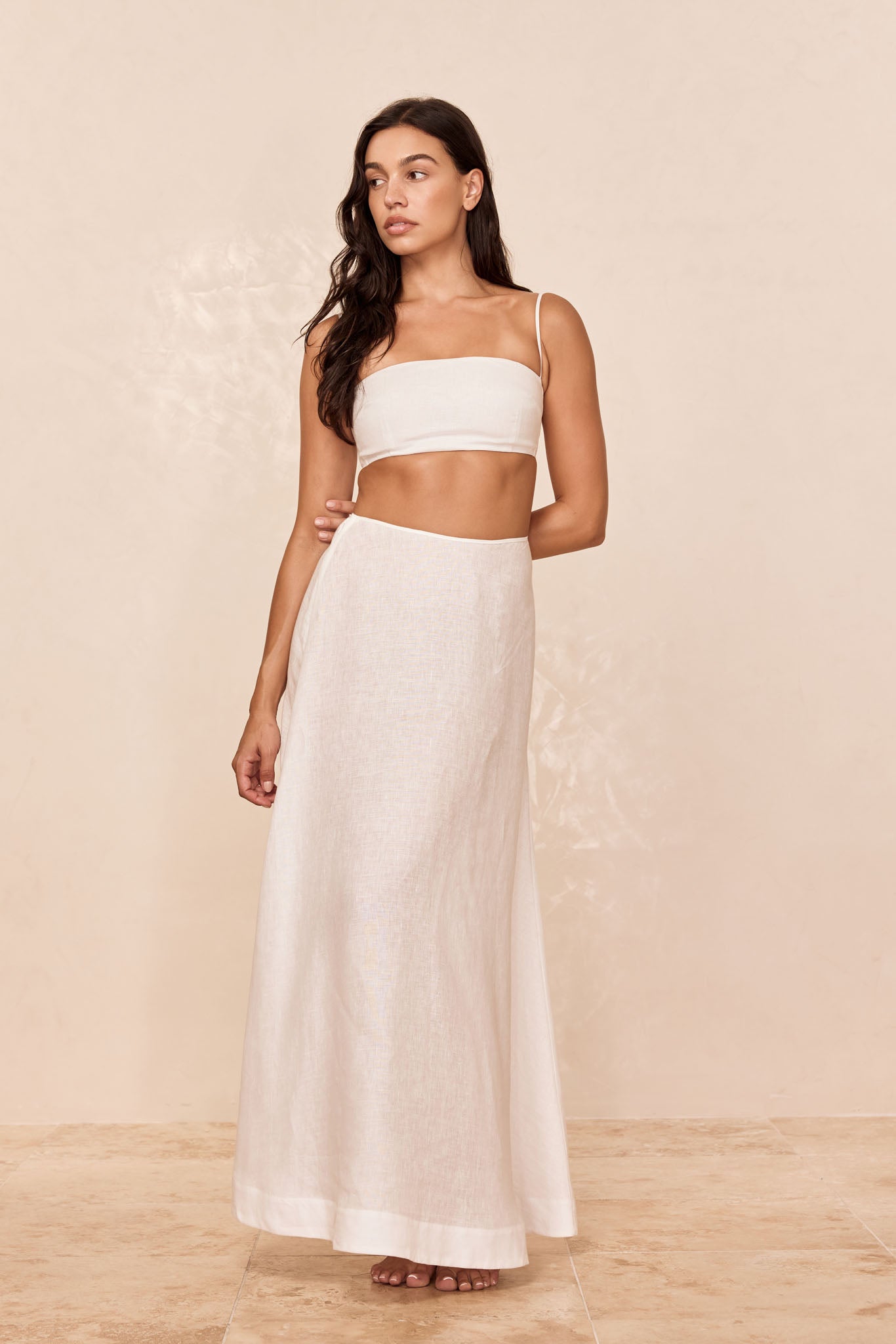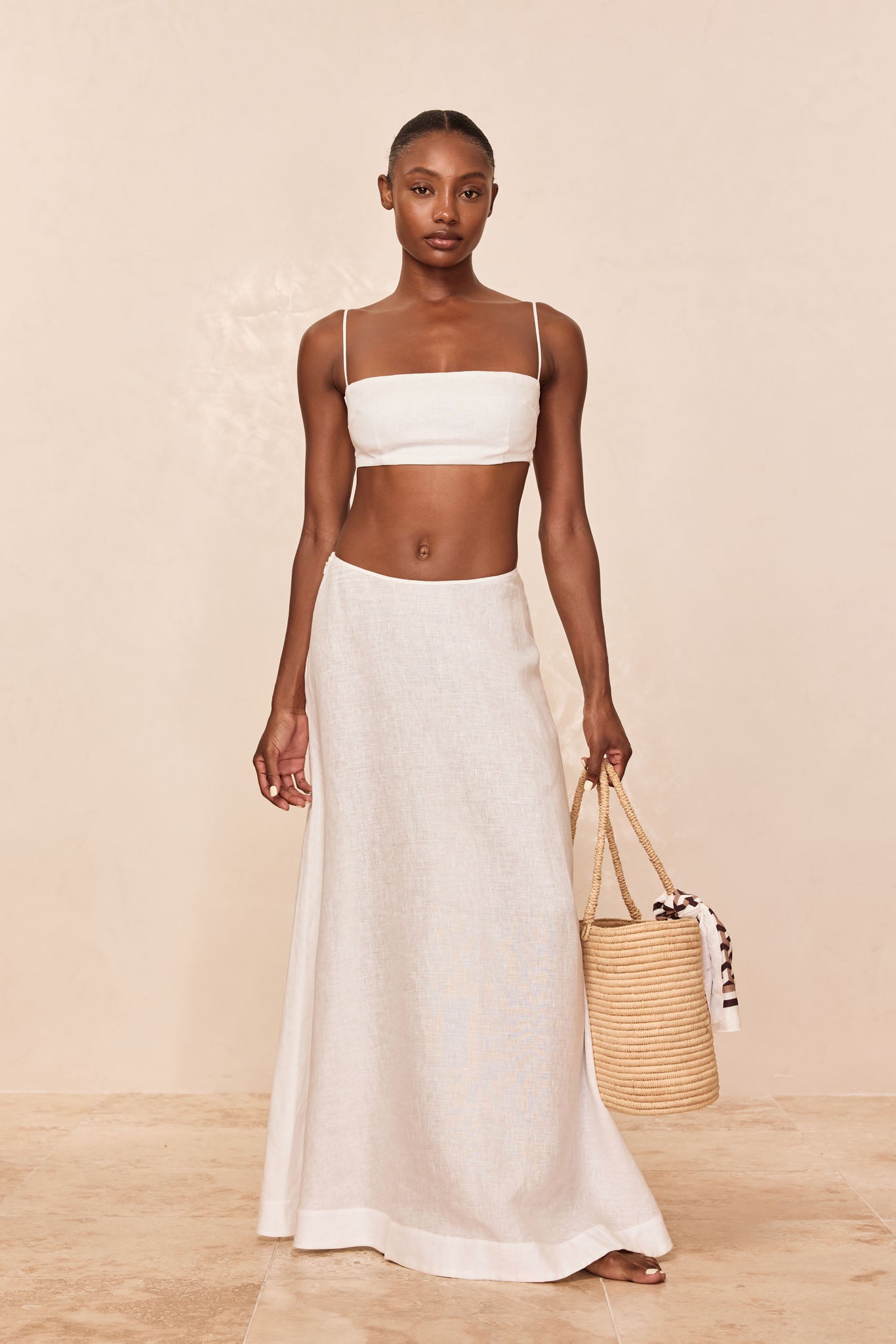 We designed the San Diego Top to be a wardrobe essential through the warmer months ahead. Made to effortlessly pair with countless options, this cropped linen tank is complete with adjustable shoulder straps and a back tie closure. Complete this chic look with the Fontelina Skirt.